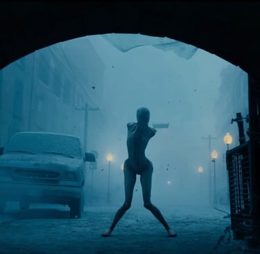 Desde o primeiro frame, o vídeo faz questão de deixar claro: não estamos diante de mais uma adaptação genérica de game. Retorno a Silent Hill abraça a estética clássica da série com a névoa densa cobrindo as ruas, o silêncio incômodo que precede o terror e aquele visual decadente característico da cidade.